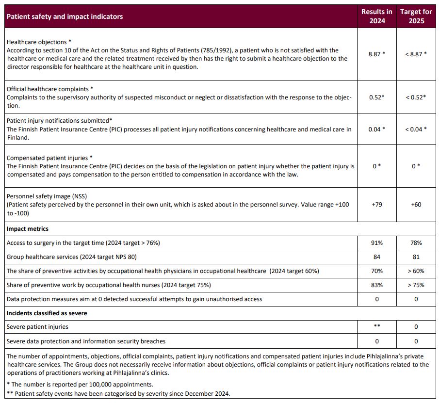 Pihlajalinna uses the Net Promoter Score (NPS) to measure the customer experience, among others. In the sustainability report, Pihlajalinna reports the NPS results and targets for health services for the coming financial years. Healthcare services include primary care and specialised care services, both for private healthcare services and public services (clinic private services, surgical operations, remote consultations, services in wellbeing services counties). Healthcare ser-vices do not include wellbeing services or customer service (gym services, contact centre). The target and results are presented in the attached table.